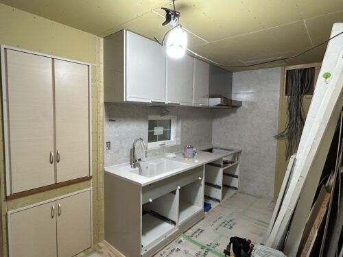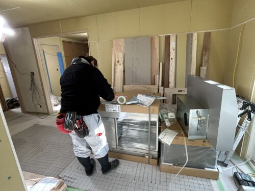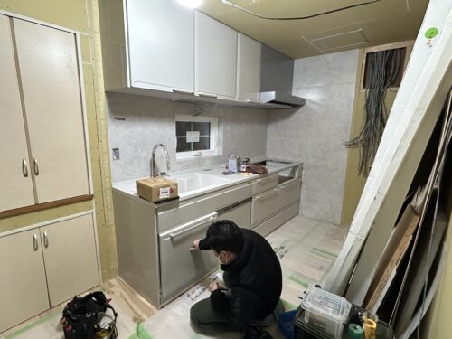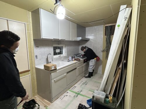 キッチン設置より周りのパネルの貼る作業の方が時間がかかるんだ。