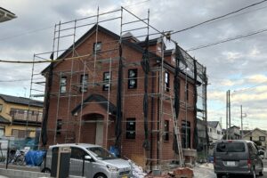 南側のレンガの積み上げは完了していますよ。 タンというダークブラウン色とレッドの赤のブレンドです。 ≫続きを読む